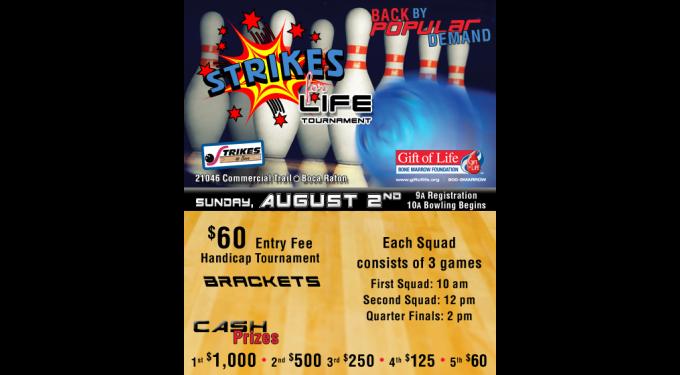 Gift of Life is a bone marrow foundation that helps save lives by advocating for the donation of life-giving bone marrow. The Strikes for Life Tournament will be held at Strikes bowling alley in Boca Raton. Cash prizes, ranging from $60-$1000, will be awarded to those coming in 1st-5th place! There will be 3 squads taking place at 10, 12 and 2 during the day. Registration begins at 9am. Sign up online for a $60 donation/fee.