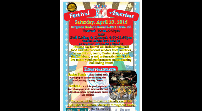 On Saturday, April 22, 2017 the Town of Davie, partnering with Joana Bueno Productions, LLC and Davie Pro Rodeo will host the Festival of the Americas, featuring a Bull Riding Event & Concert at the Bergeron Rodeo Grounds. This one day event will include traditional food and international vendors from countries around North, South, Central America and the Caribbean, as well as fun activities for kids, live music and an exciting Bull Riding Event! The Festival of the Americas will begin at 12:30pm and finish at 6:30pm. The Bull Riding Event and Concert will start at 6:00pm and conclude at 11:30pm. The evening events will include live musical performances, lots of food and a full night of entertaining activities. To top the evening off, there will be Professional Bullriding, featuring top international athletes competing together and representing their countries. Following the Bull Riding Event, there will be a concert featuring a Brazilian country western band.