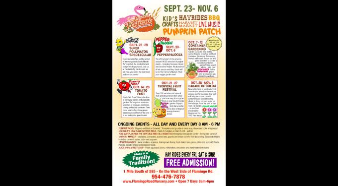 Come see why they call the Flamingo Road Nursery's Harvest Festival the "Biggest & Best" in Broward County. They have pumpkins and gourds in several sizes, shapes and colors. Pick up all you need for Fall decor in the Harvest Market where they sell hay bales, scarecrows, Indian corn, cornstalks, and more. You can also pick up some delectable Caramel apples to enjoy. At the Farmer's Market you can find homemade pies, fresh jellies, local produce and local honey. Enjoy a boxed lunch, smoothie or handmade truffle by the pond on property. On the weekend, indulge in good ole Southern-style BBQ, live music, and tractor-pulled hayrides! Tow Mater and Herbie the Love Bug will be on site for photo opportunities until November 8th. Hayrides every Friday thru Sunday.