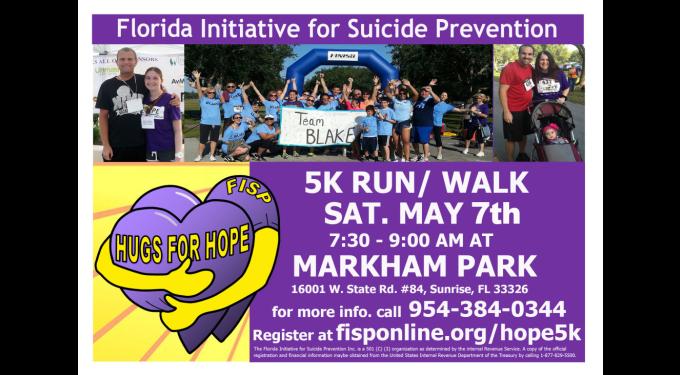 Please come out to the HUGS for HOPE 5k Saturday, May 7th at Markham Park in Broward county. This event will support Hope Clubs in local schools. HOPE stands for Helping to Overcome Problems Effectively. The run will be hosted by the Florida Initiative for Suicide Prevention, Inc. (FISP). The FISP reaches about 40,000 people each year through education, support and advocacy efforts. Hope Clubs educate, support, and develop problem solving and coping skills, leadership skills, while fostering the prevention of suicide, bullying and substance abuse and many other important issues teens encounter.