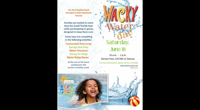 Wacky Water Day will be held on Saturday, June 18th at John Denson Pool, located at 225 NW 12th Ave., from 10:00 a.m. – 12:00 p.m. Activities will include family friendly games like Cannonball Pool Jump, Sponge Bob Pass, Water Shootout, Diving for Rings, and Water Relay Races. A representative from the Palm Beach County Drowning Prevention Coalition will be present to provide information to participants about safe swimming. Snacks and water will be provided.