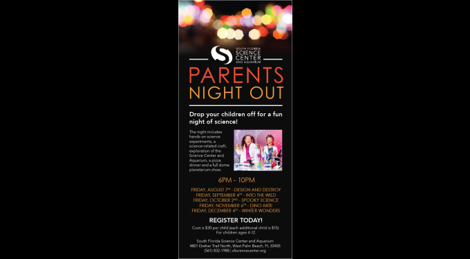 Have an evening to yourselves while the children have some educational fun at the South Florida Science Museum in West Palm Beach. Kids can partake in hands-on science experiments and science related crafts. A planetarium show and pizza will be provided for the evening. Kids can explore the exhibits and the aquarium areas of the museum. The event runs for 4 hours which is perfect for a dinner and a movie nearby or just for some hours of peace at home. Children need to pre-register.